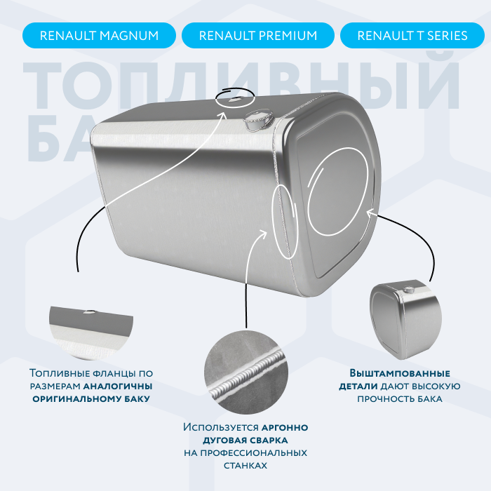 Алюминиевый бак не подвержен коррозии, что делает его более долговечным, а так же сбережет вашу топливную систему. Бак из алюминия в два раза легче стального бака, хотя он и изготовлен из листа увеличенной толщины в 2,5 мм. В конструкции предусмотрены цельные перегородки, которые проварены по периметру. Баки из алюминия так же оснащены заливной горловиной с самозапираемым непроливаемым клапаном (который становится барьером для разлива топлива, а так же становится защитой от попадания мусора в бак при открытой крышке) . Кроме того, однозначно что алюминиевый бак выглядит намного привлекательнее и дороже - где бак в том числе становиться и элементом тюнинга автомобиля. На алюминиеввые баки действует увеличенная гарантия - 36 месяцев.