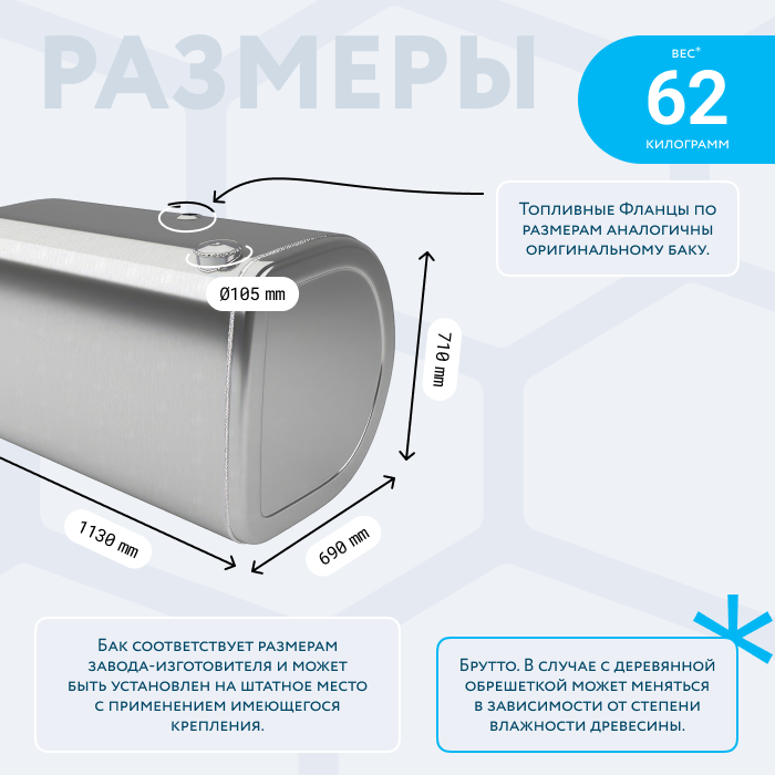 - Так же, если вы приобретаете алюминиевый топливный бак, он будет в деревянной обрешетке (для усиления защиты при транспортировке). При просчете веса и объема, цена за доставку может измениться по факту взвешивания на самом терминале транспортной компании. Так как деревянная обрешетка соответственно изготовлена из древесины, и она имеет свойство значительно набирать вес в зависимости от влажности окружающей среды.